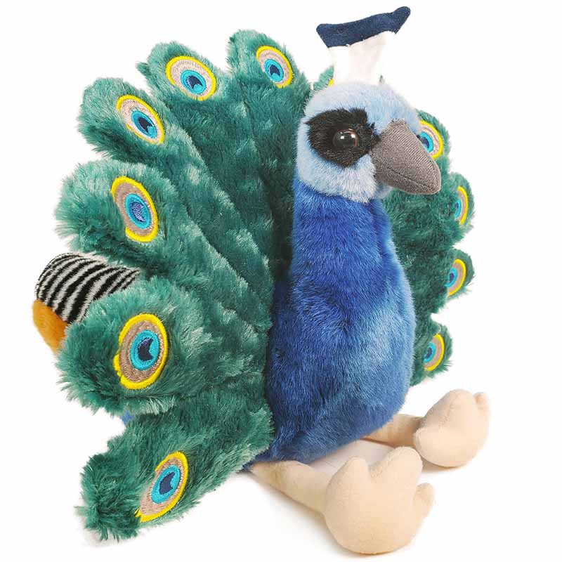 Peacocks represent beauty and elegance, and plush designs often focus on the tail rather than cuddling comfort. Decorative tails must feel soft while visually impressive.