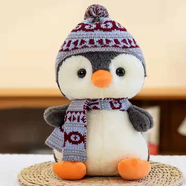 Accessories such as scarves or hats instantly signal holiday and winter themes. Penguin plush toys wearing winter accessories are visually effective without requiring printed seasonal messages.