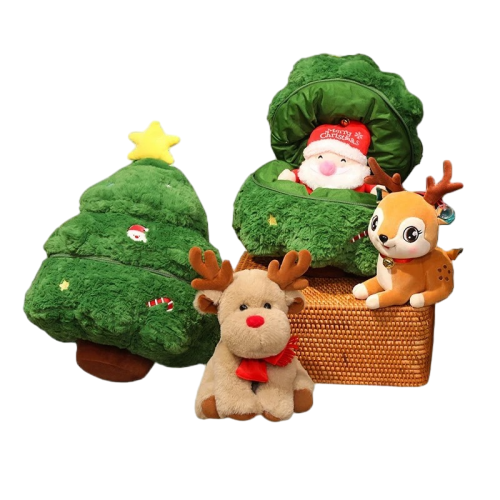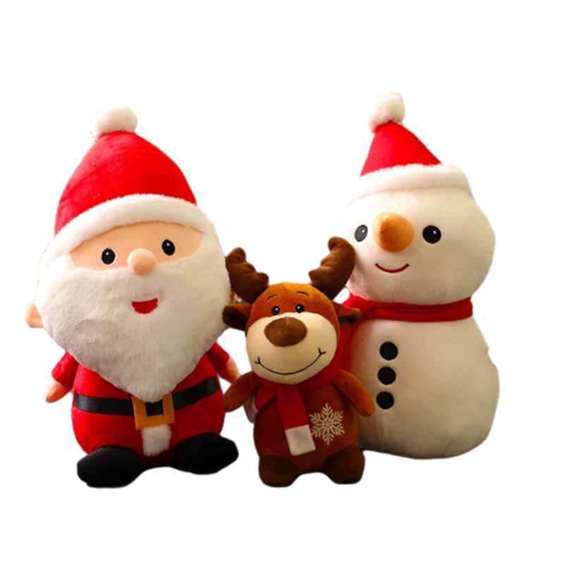 Santa dolls, reindeer plushies, snowman toys, elf mascots, holiday cushions.