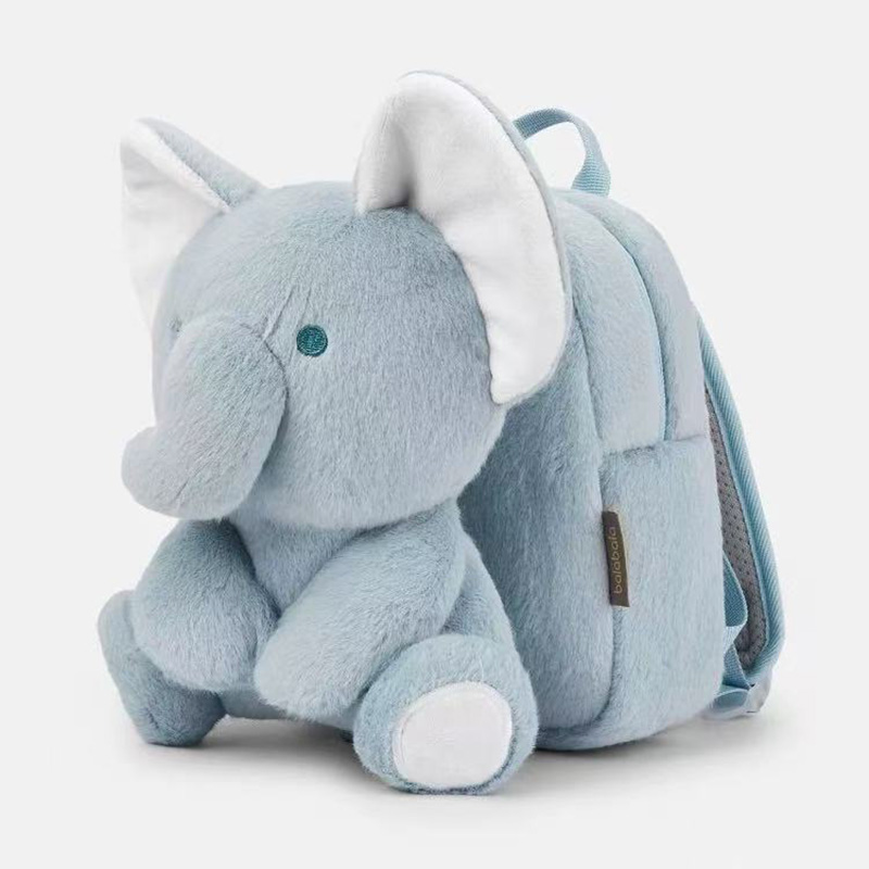 Large-eared elephant backpack featuring soft blue plush and safe zippers.