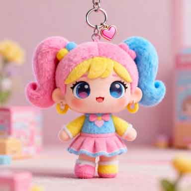 Trendy doll-inspired and cartoon plush keychains for younger audiences and online shops.