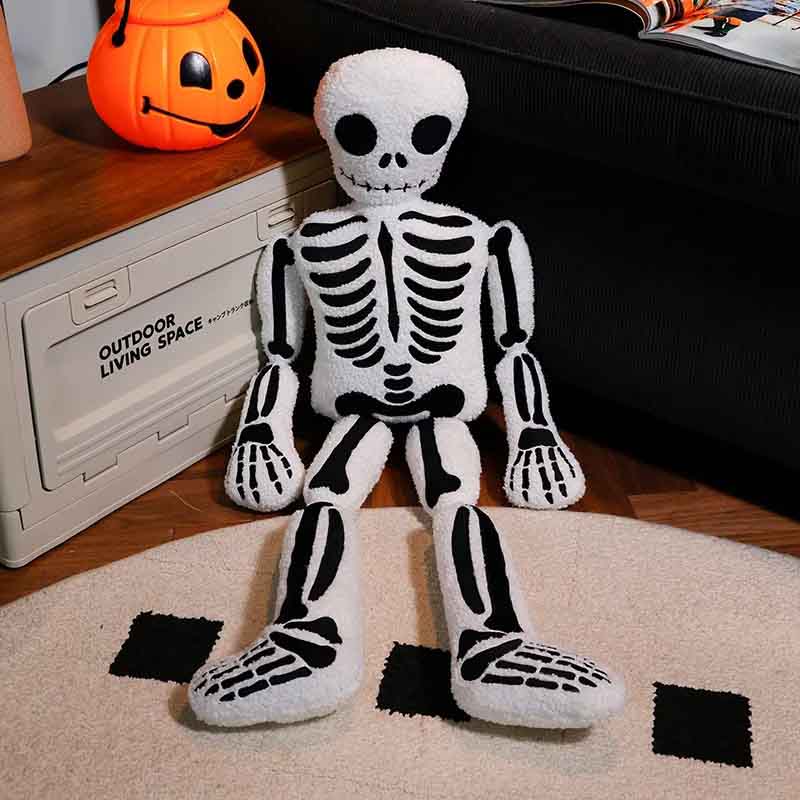 For décor, skeleton plush works well on sofas, beds, shelves, and store displays because the contrast between black and white pops visually. The construction should avoid hard internal structures; instead, soft shaping and stitched bone lines provide the skeleton look without discomfort. Skeleton plush also performs well in themed sets, pairing naturally with bats, pumpkins, and ghosts.