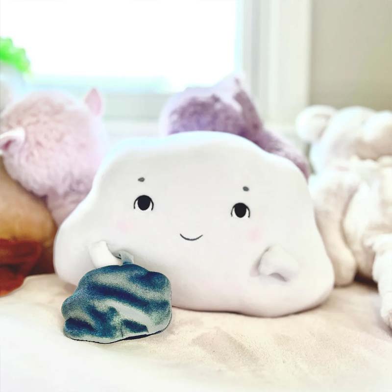The facial design is extremely restrained. Most kawaii cloud plush toys use small embroidered eyes and a curved smile placed low on the face, which creates a relaxed, reassuring expression. Some designs include blush cheeks to add warmth, but excessive detail is avoided. Color choice is critical—white, cream, or very light pastel blue are most common, reinforcing a clean and peaceful aesthetic.