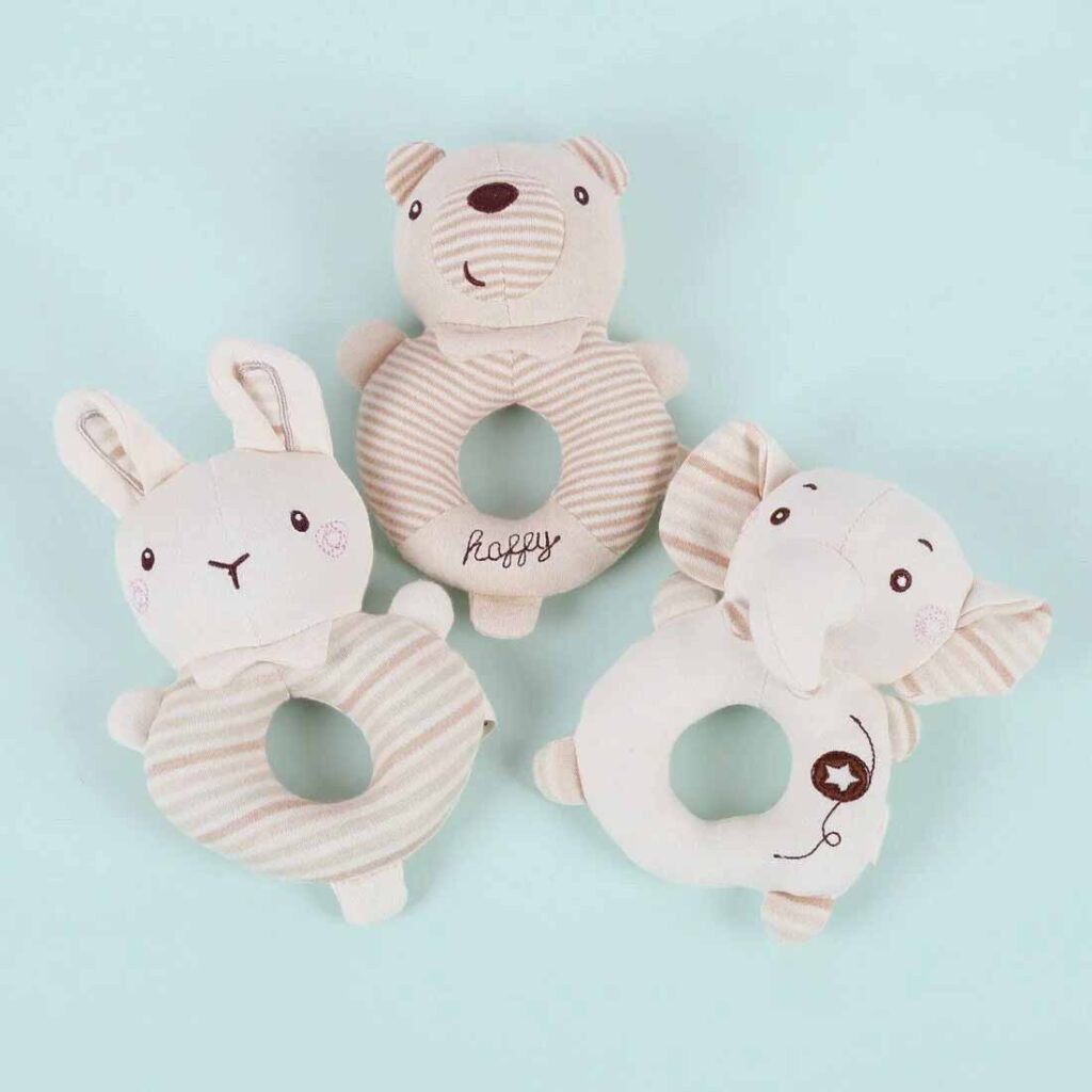 For baby brands, organic cotton plush rattles are often positioned as first-interaction toys. They encourage grasping, shaking, and hand–eye coordination while reassuring parents that no synthetic dyes, chemical residues, or loose components are present. These products perform especially well in newborn gift sets and early developmental toy assortments.